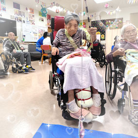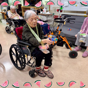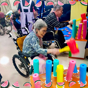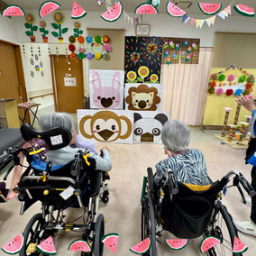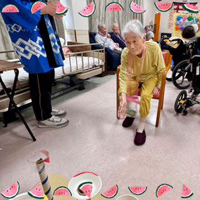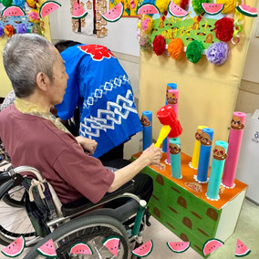 デイサービス内で夏祭りを開催しました。会場にはもぐらたたきやお菓子釣り、的当てなどのゲームを設け、利用者の皆様に自由に参加していただきました。提灯の飾り付けで会場は夏らしい雰囲気に包まれ笑顔や歓声があふれる賑やかな時間になりました。童心にかえって夢中でゲームに取り組まれる姿もみられ、夏の思い出となるひとときになりました。