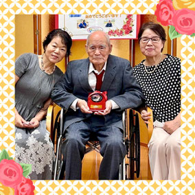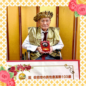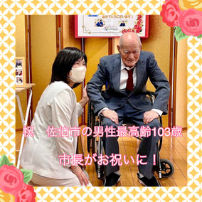 佐伯市の男性最高齢103歳の入所者の方を市長がお祝いに来られました。心温まるお祝いの言葉と記念品が贈られました。ご家族の娘さんも同席され、和やかな雰囲気の中でこれまでの歩みを振り返りながら喜びに満ちたひとときとなりました。これからもますますお元気でお過ごしいただけることを願ってます。